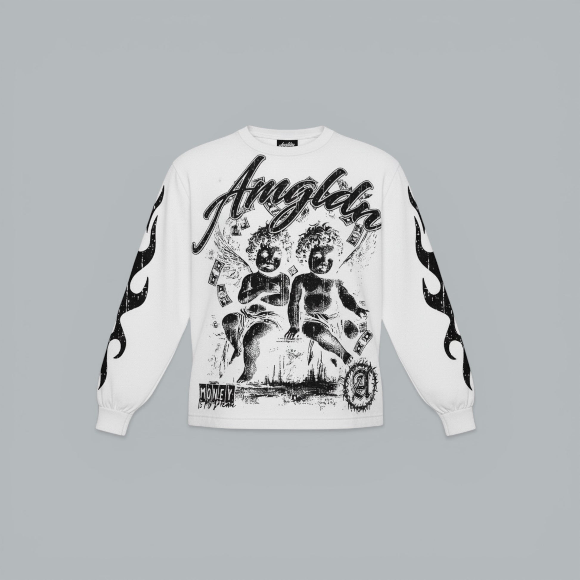 The front features a striking angel graphic layered with gritty textures and motion, white the back hits with oversized Richgod Gallery branding for the unmistakable presence. Flame graphics run down both sleeves.